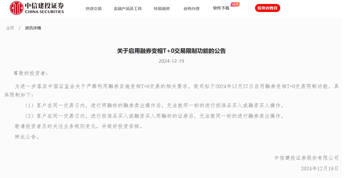 【環球網財經綜合報道】12月19日,中信建投於官網發佈《關於啓用融券變相T+0交易限制功能的公告》(下稱《公告》)。《公告》提到,為進一步落實中國證監會關於嚴禁利用融券實施變相T+0交易的相關要求,中信建投擬於12月27日啓用融券變相T+0交易限制功能。