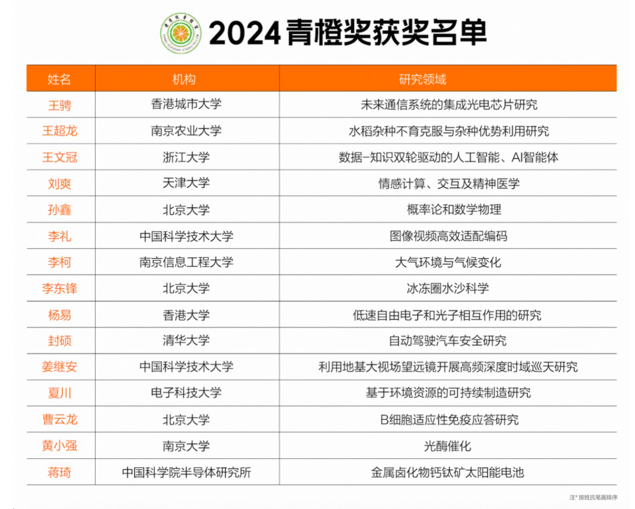 2024青橙獎名單公佈 15名學者奪得百萬科研大獎