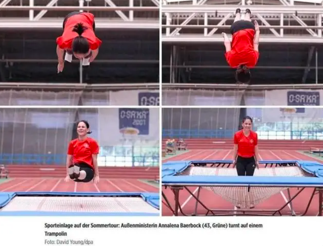 德國外長貝爾伯克今年7月即興表演蹦牀 圖源:德新社