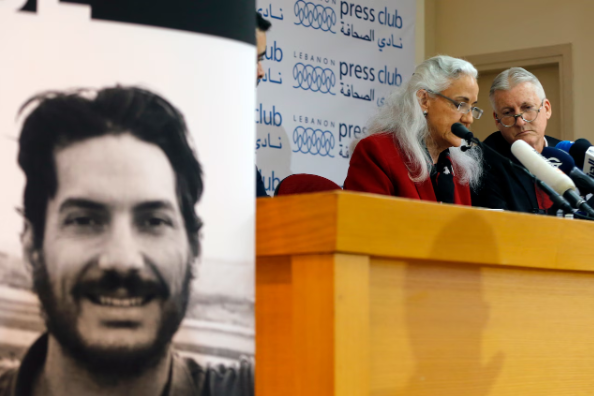 △2018年12月4日,黎巴嫩貝魯特,在敍利亞失蹤近6年的奧斯汀·泰斯的父母在新聞發佈會上發言。