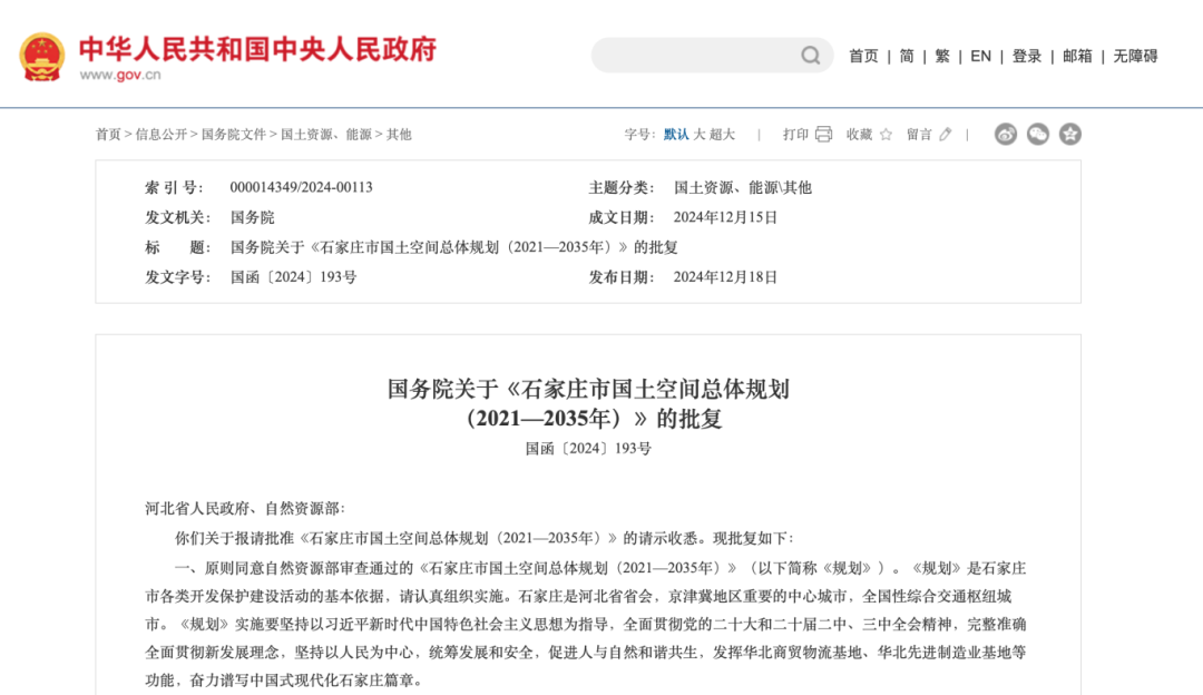 日前,根據中國政府網消息,國務院發佈關於《石家莊市國土空間總體規劃(2021—2035年)》的批覆。