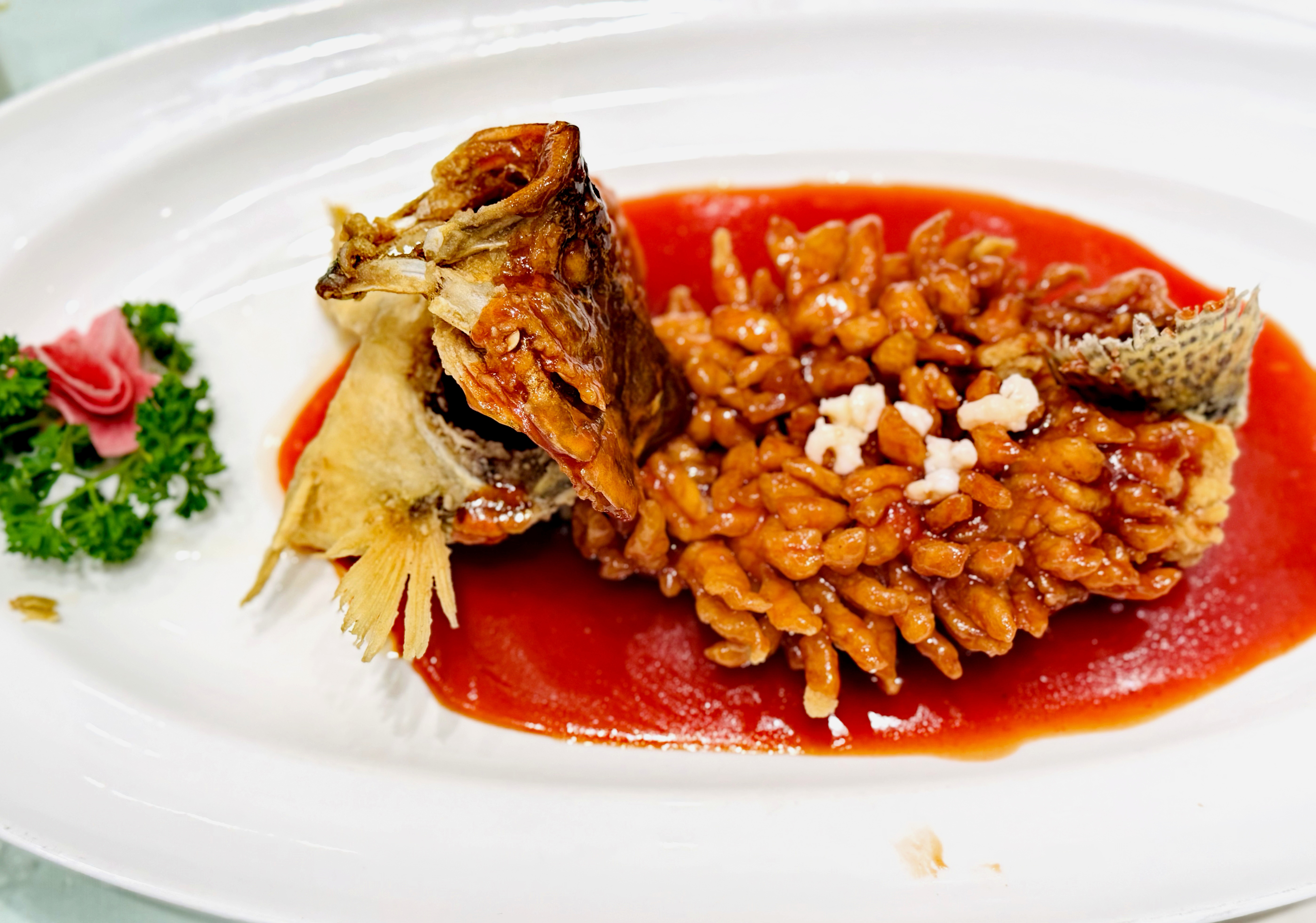 尺把長的鱖魚在盤中昂頭翹尾,魚身去骨,改上花刀,油炸後端上桌,再澆上酸甜的番茄汁,魚身吱吱作響,像極了松鼠的叫聲,外酥裏嫩,酸甜美味。一塊入口,滿口留香。
