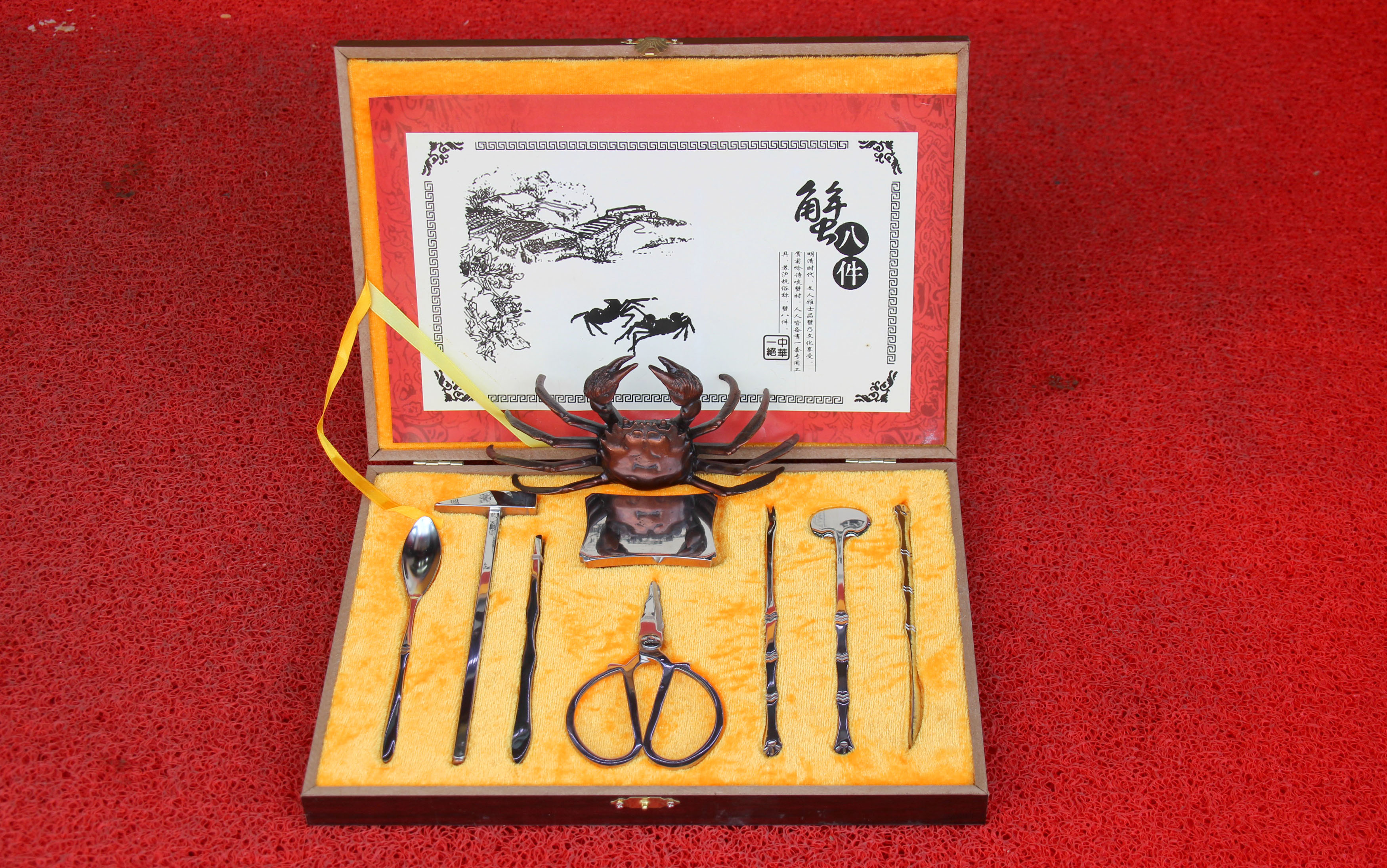 吃大閘蟹的樂趣,不在於結果,而在於過程。大閘蟹外殼堅硬,不易拆分,蘇州人為了讓吃蟹成為一件風雅之事,可謂煞費苦心。據説,明代一位叫漕書的蘇州人,發明了錘、刀、鉗三件工具來對付螃蟹的硬殼,後來逐漸成為八件,也就是現在的“蟹八件”,時人寫詩調侃:“錘敲蟹殼唱八件,金鋸剖螯舉觴鮮。吟詩賞菊人未醉,舞鈎玩鑷樂似仙。”可見江南人對優雅用餐的追求。