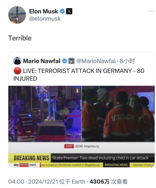 他還分享了一段關於馬格德堡聖誕市集上應急救援現場的直播視頻,並評論説,“太可怕了。”