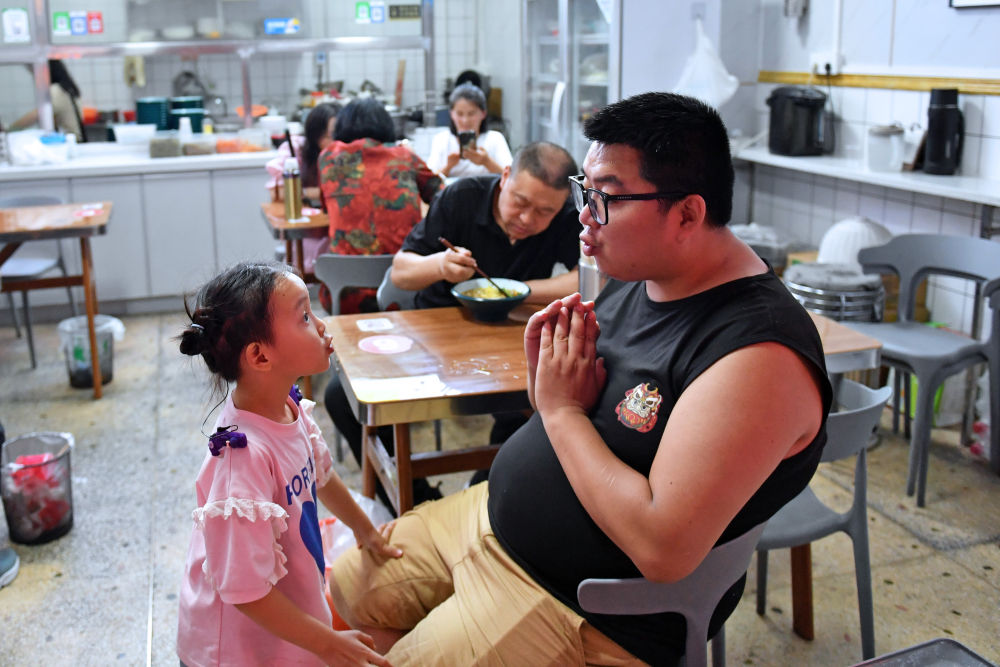 ↑5月15日,在湖南省長沙市,剛植入人工耳蝸不久的“無聲小吃攤”攤主張永勝(右)在女兒張語涵(左)幫助下練習發音。新華社記者 陳振海 攝