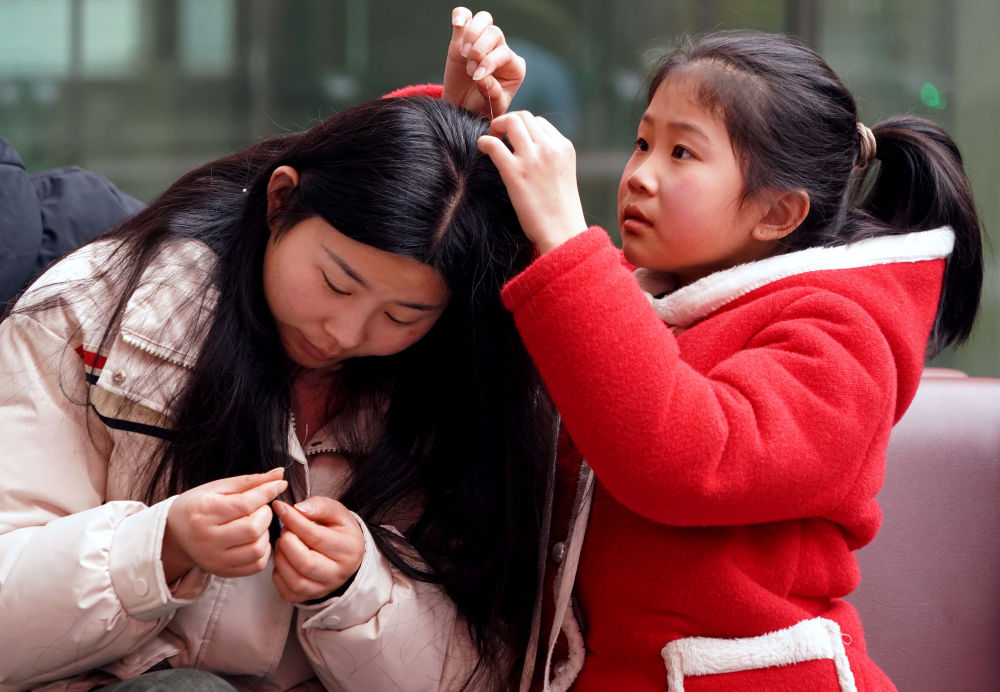 ↑1月26日,在鄭州東站候車大廳,一名小朋友在候車時幫媽媽拔白頭髮。新華社記者 李安 攝