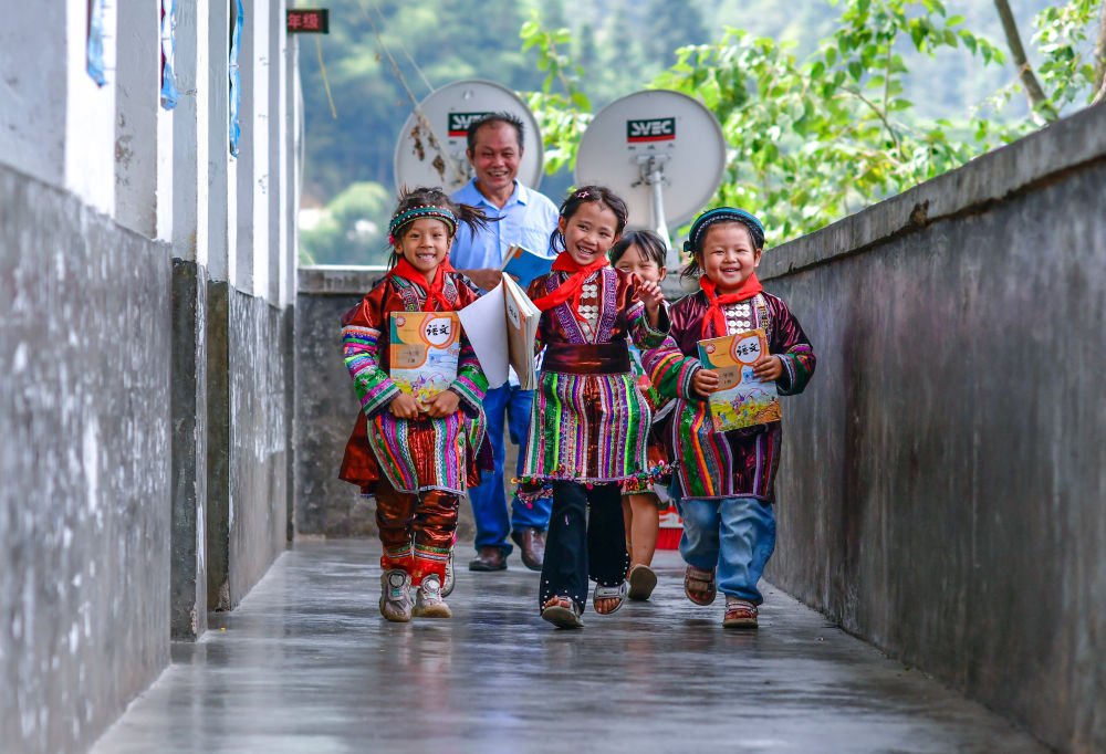 ↑9月6日,在貴州省黔東南苗族侗族自治州從江縣西山鎮的中寨教學點,59歲的老師孟榮達(後)與學生們在下課後走出教室。新華社記者 楊文斌 攝