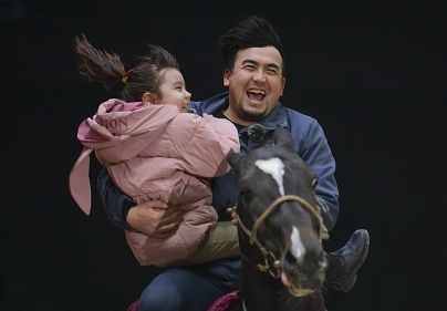 ↑3月7日,在位於新疆昭蘇的新疆野馬集團古生態園汗血馬基地,馴馬師希爾扎提抱着4歲的女兒夏克拉一起騎馬。新華社記者 王菲 攝