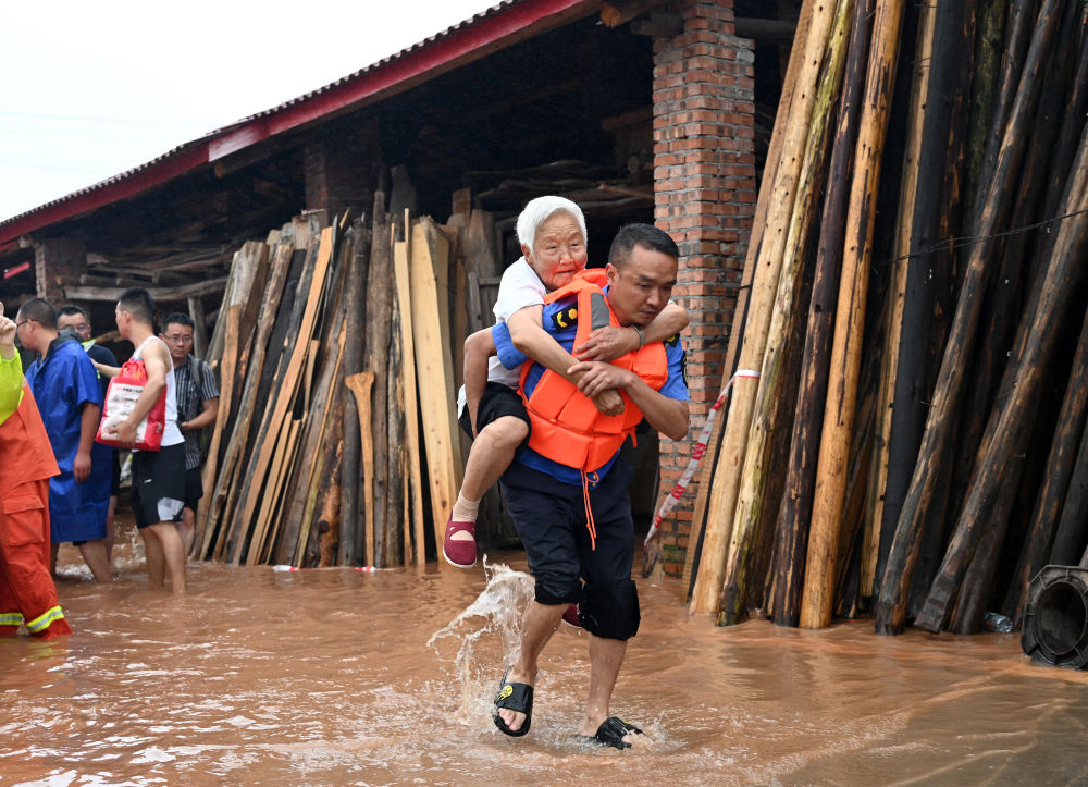 ↑7月14日,在四川省內江市東興區田家鎮,暴雨天氣發生後,救援人員轉移被困羣眾。新華社發(唐明潤攝)