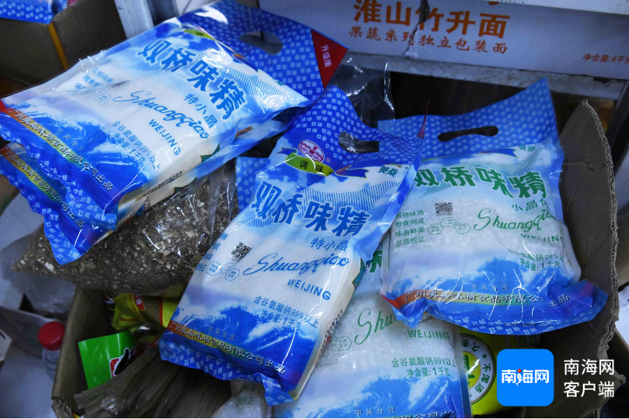 位於城東集貿市場內的海口瓊山朱苗德商行內,貨架上擺放有250克、500克、1000克三種規格的“雙橋”味精,執法人員在表明身份後對上述味精產品進行檢查。“這些‘雙橋’味精產品包裝印刷,以及二維碼都與正品有差異。”經工作人員鑑定,該批“雙橋”味精產品同樣為涉嫌侵權假冒產品。據該商行老闆稱,這些“雙橋”味精產品是他們從微信上聯繫對方,然後微信上的人騎車送到店內的,收貨時沒有任何進貨單據、供貨商資質證明材料等。