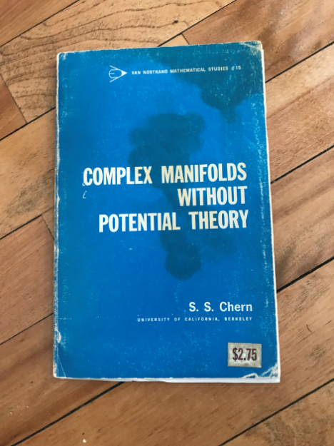 我師從陳先生,學習了復幾何的陳氏特徵類,對我的學問有裨益。陳先生60歲那年,在我行將畢業時,送了一本他寫的書給我,書名叫《不具位勢原理的複流形》(Complex Manifolds without Potential Theory)。他在書中親題贈言,説:“餘生六十矣,薪傳有人,願共勉之。”