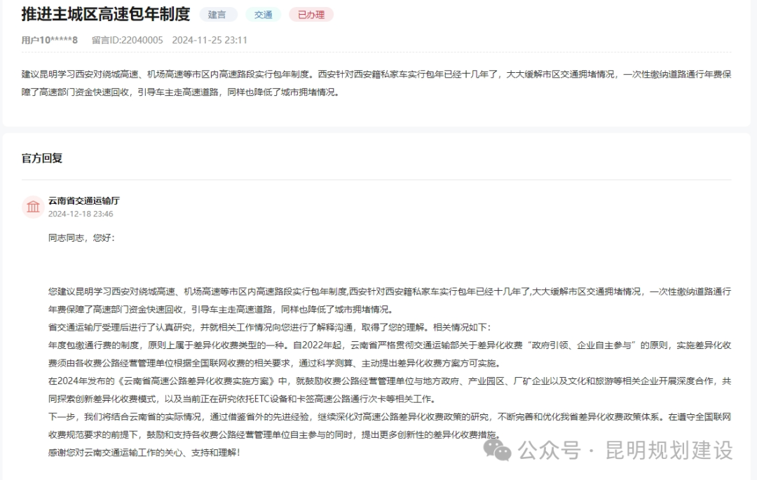 近日,有網友通過人民網領導留言板反映,希望昆明能推進主城區高速包年制度。雲南省交通運輸廳進行了回覆。