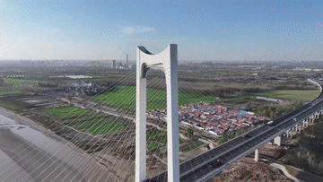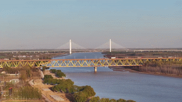 一橋架南北,天塹變通途。橫跨黃河的高速公路與堤壩公路縱橫交錯、相輔相成,成為冬日裏的一道靚麗風景線。