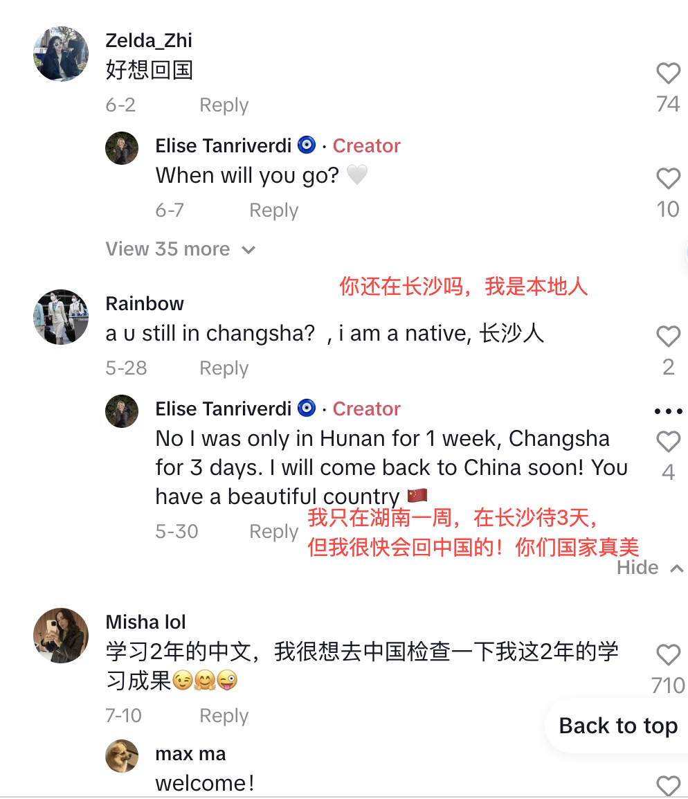 在評論區裏,有正處海外的長沙本地人問她是否還在長沙遊玩時,她遺憾地説旅程很短暫,並戀戀不捨地回覆:“我會再回到中國!你們的國家真美。”