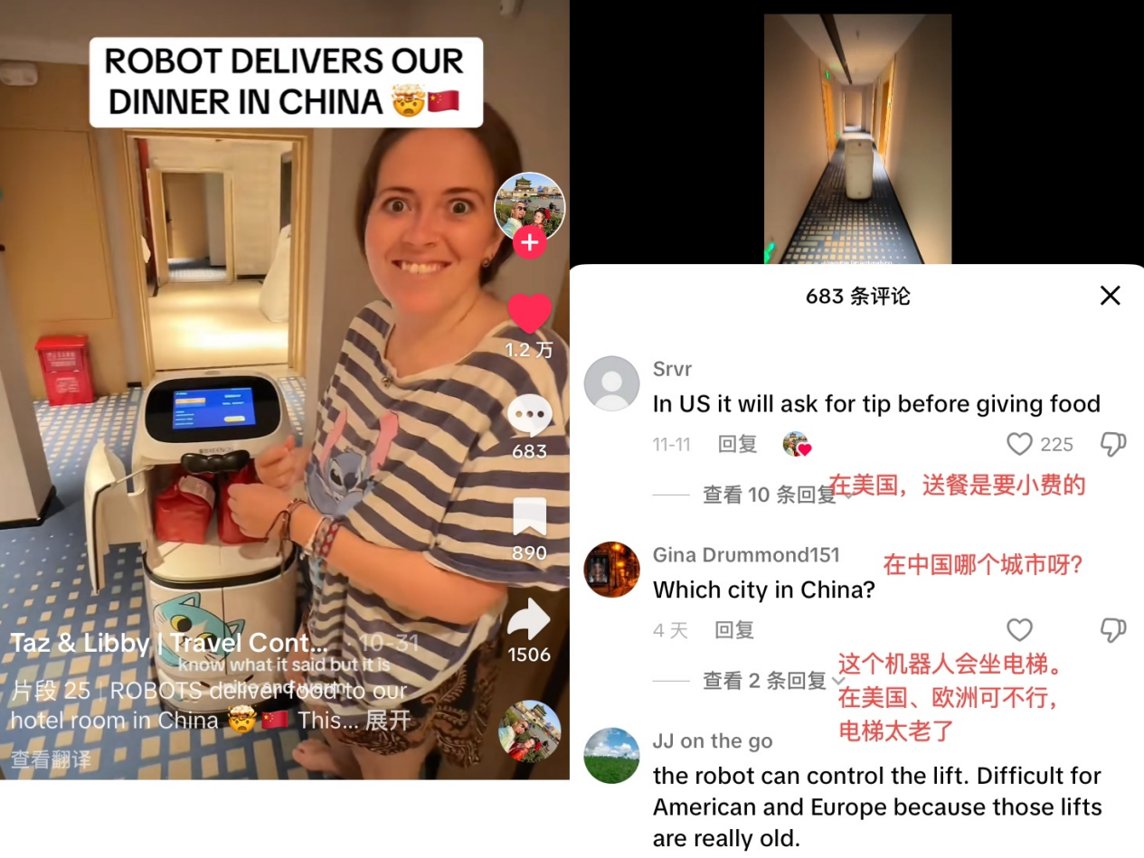 英國夫婦Taz和Libby在TikTok上分享了一段獨特的住酒店經歷。“你們能想象到嗎,中國的機器人可以把晚餐送到我的房門!”他倆拍下了機器人送餐的全過程,一邊吃烤鴨一邊“炫耀”地問:“太瘋狂了,你們之前見過嗎?”