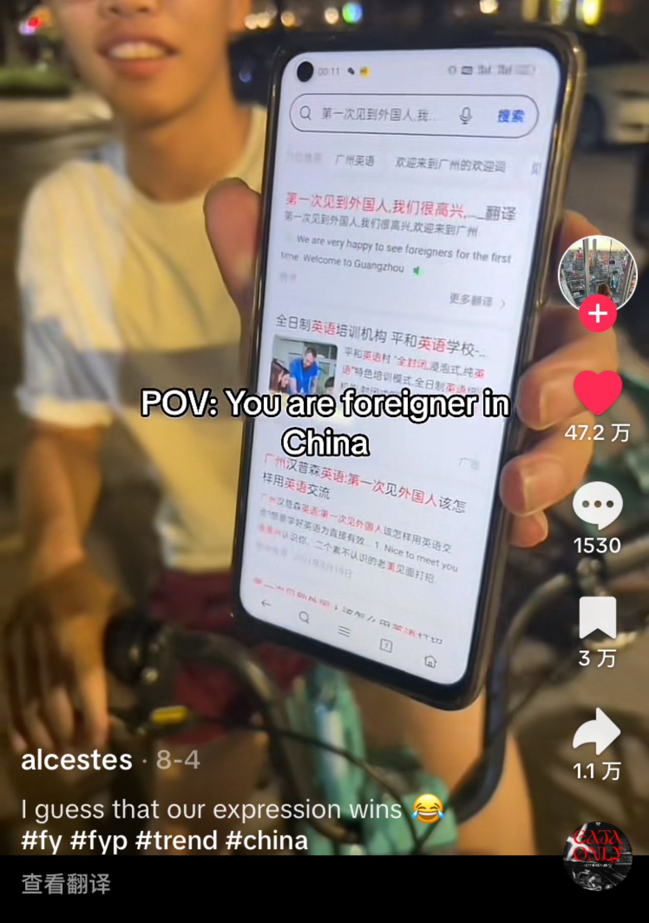 TikTok網友@alcestes記錄了她和朋友們在廣州遊玩時的暖心場景。在廣州街頭,一位小夥主動跟她們打招呼。小夥英語不熟練,為了展現自己的善意,他用手機把“第一次見到外國人,我們很高興。”翻譯成英語,並放音頻給她們一行人聽。