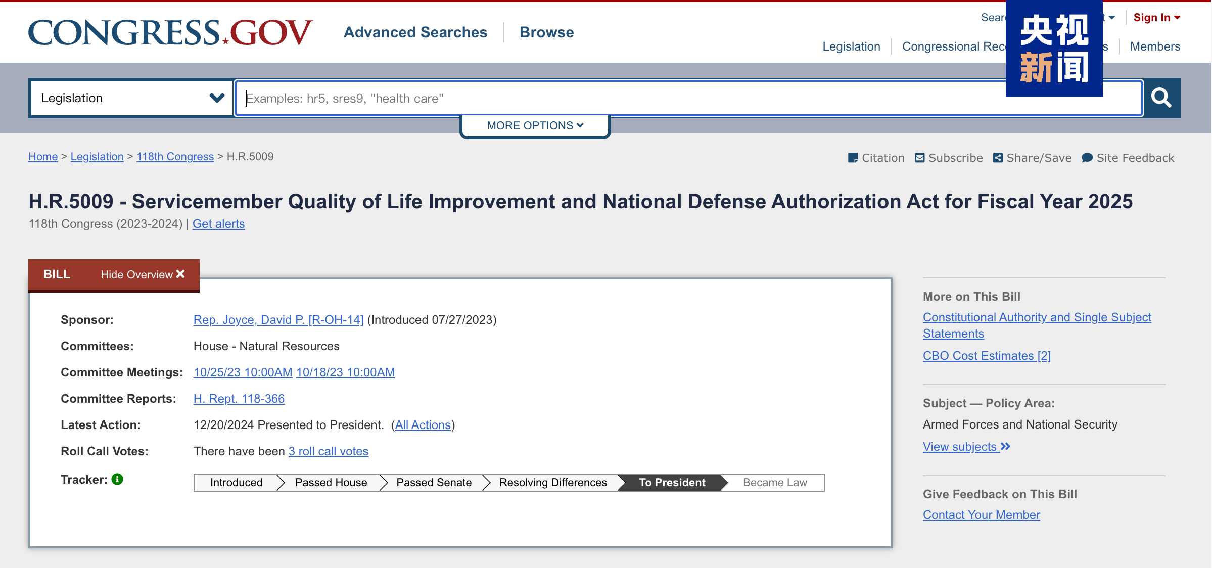 這樣的交易在美國政治史上的確不是第一遭。但值得注意的是,就在此前一天,即12月19日,美國參議院通過了《HR5009-2025財年軍人生活質量改善和國防授權法案》。