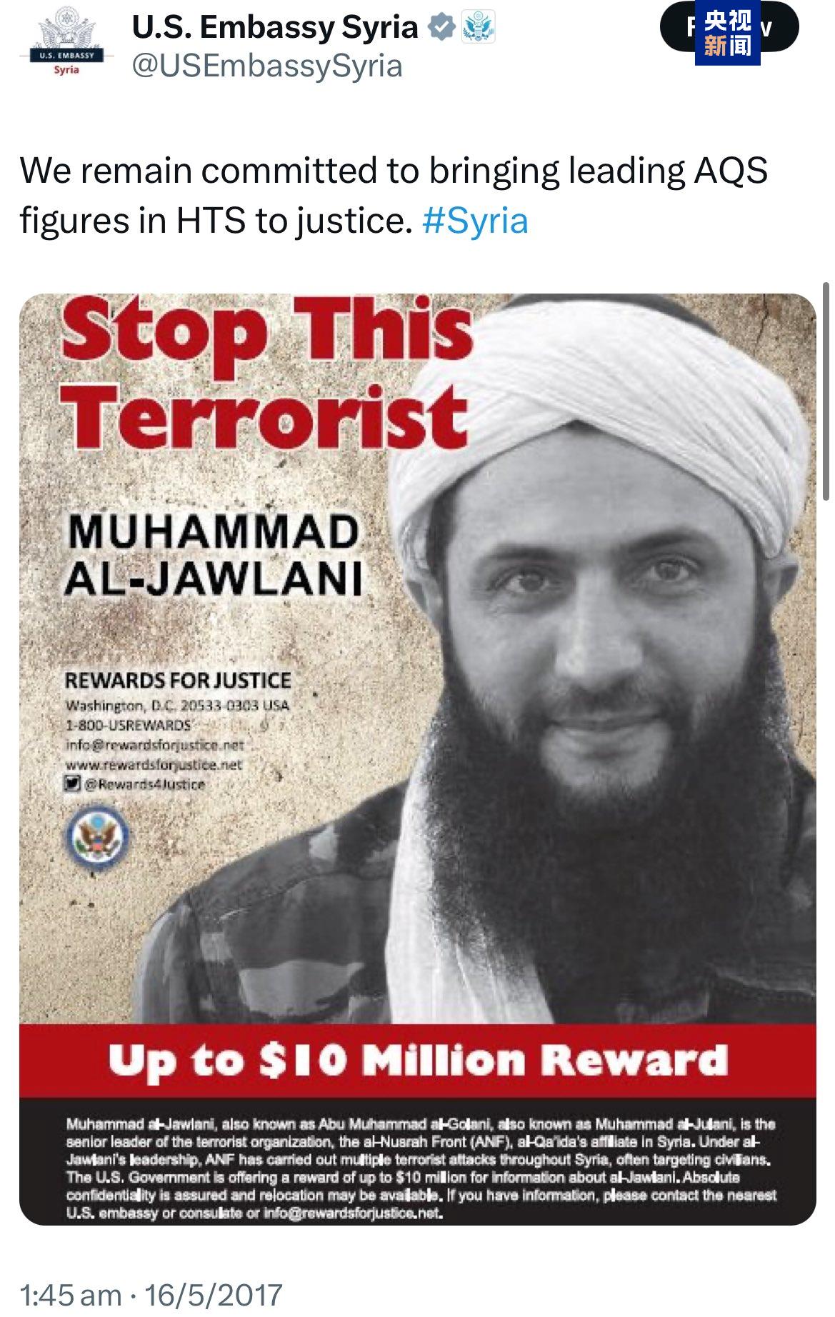 △2017年5月16日 美國駐敍利亞大使館:我們致力於將這名“沙姆解放組織”中的基地組織敍利亞分支頭目繩之以法。