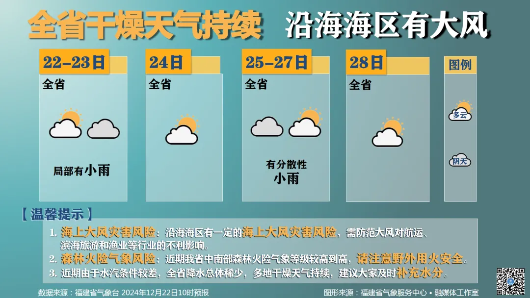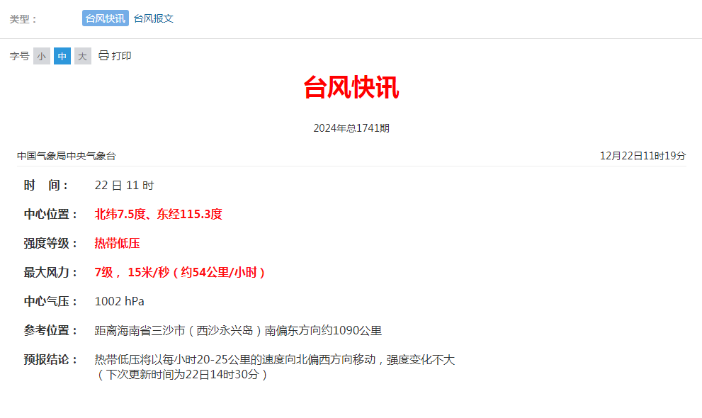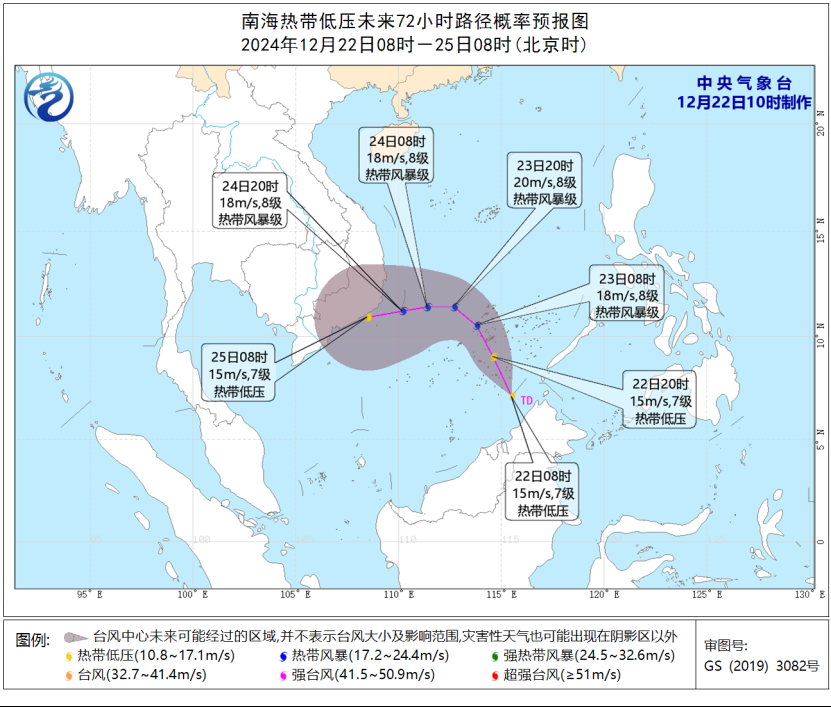 12月22日14時至23日14時,受冷空氣和熱帶低壓的共同影響,福建沿海、 廣東沿海、海南島沿海、台灣島沿海、東海南部、台灣海峽、台灣以東洋麪、南海大部、巴士海峽、北部灣將有6-7級大風,陣風8-9級,其中台灣海峽、福建沿海、 南海北部和南部的部分海域、西沙羣島和南沙羣島附近海域風力將有8-9級,陣風10-11級。