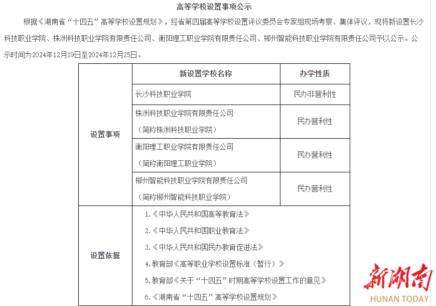 近日,湖南省教育廳發佈高等學校設置事項公示,根據《湖南省“十四五”高等學校設置規劃》,經省第四屆高等學校設置評議委員會專家組現場考察、集體評議,現將新設置*長沙科技職業學院、株洲科技職業學院有限責任公司(簡稱株洲科技職業學院)、衡陽理工職業學院有限責任公司(簡稱衡陽理工職業學院)、郴州智能科技職業學院有限責任公司(簡稱郴州智能科技職業學院)*予以公示。公示時間為2024年12月19日至2024年12月25日。