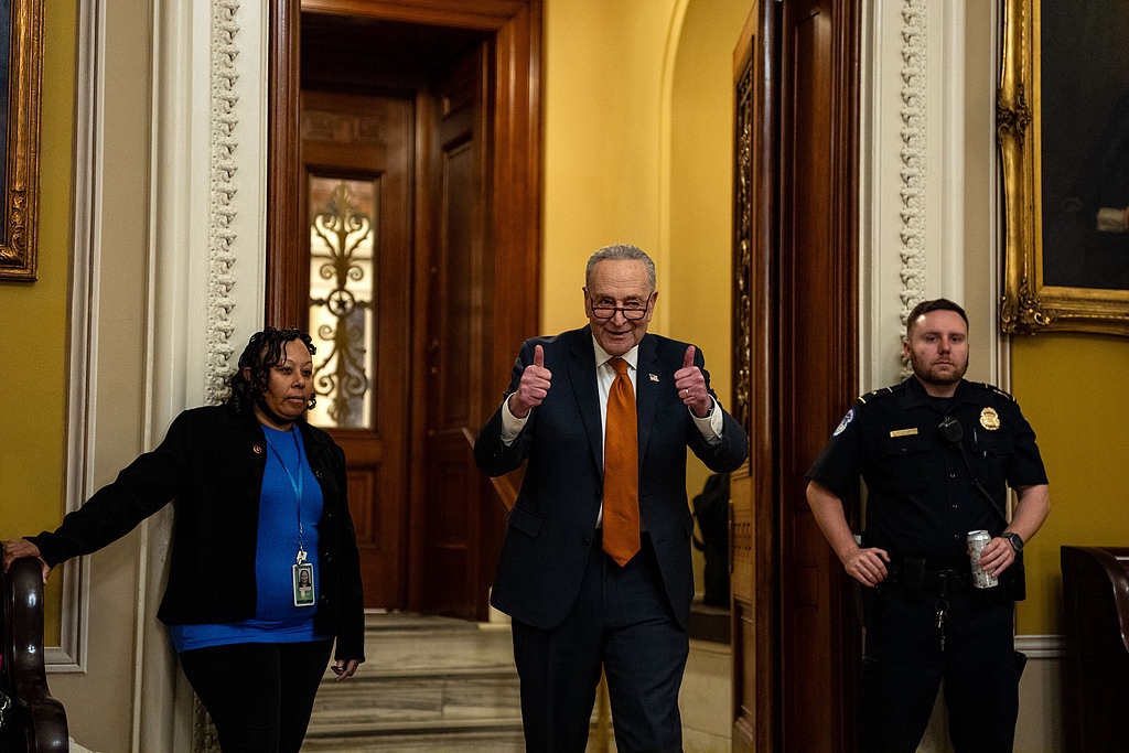 △當地時間2024年12月20日,美國參議院多數黨領袖舒默在國會大廈參議院發言後,豎起大拇指走出參議院。(圖自視覺中國)