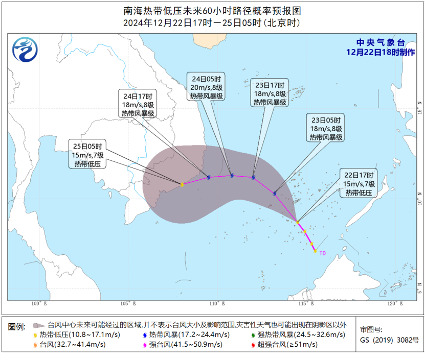 中央氣象台12月22日18時繼續發佈熱帶低壓預報