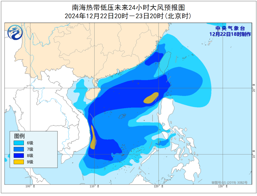 *大風預報:*12月22日20時至23日20時,受冷空氣和熱帶低壓的共同影響,福建沿海、廣東沿海、海南島沿海、台灣島沿海、東海南部、台灣海峽、台灣以東洋麪、南海大部、巴士海峽、北部灣將有6-7級大風,陣風8-9級,其中台灣海峽、台灣島西部沿海、福建沿海、南海北部和西南部的部分海域、西沙羣島和南沙羣島附近海域風力將有8-9級,陣風10-11級。