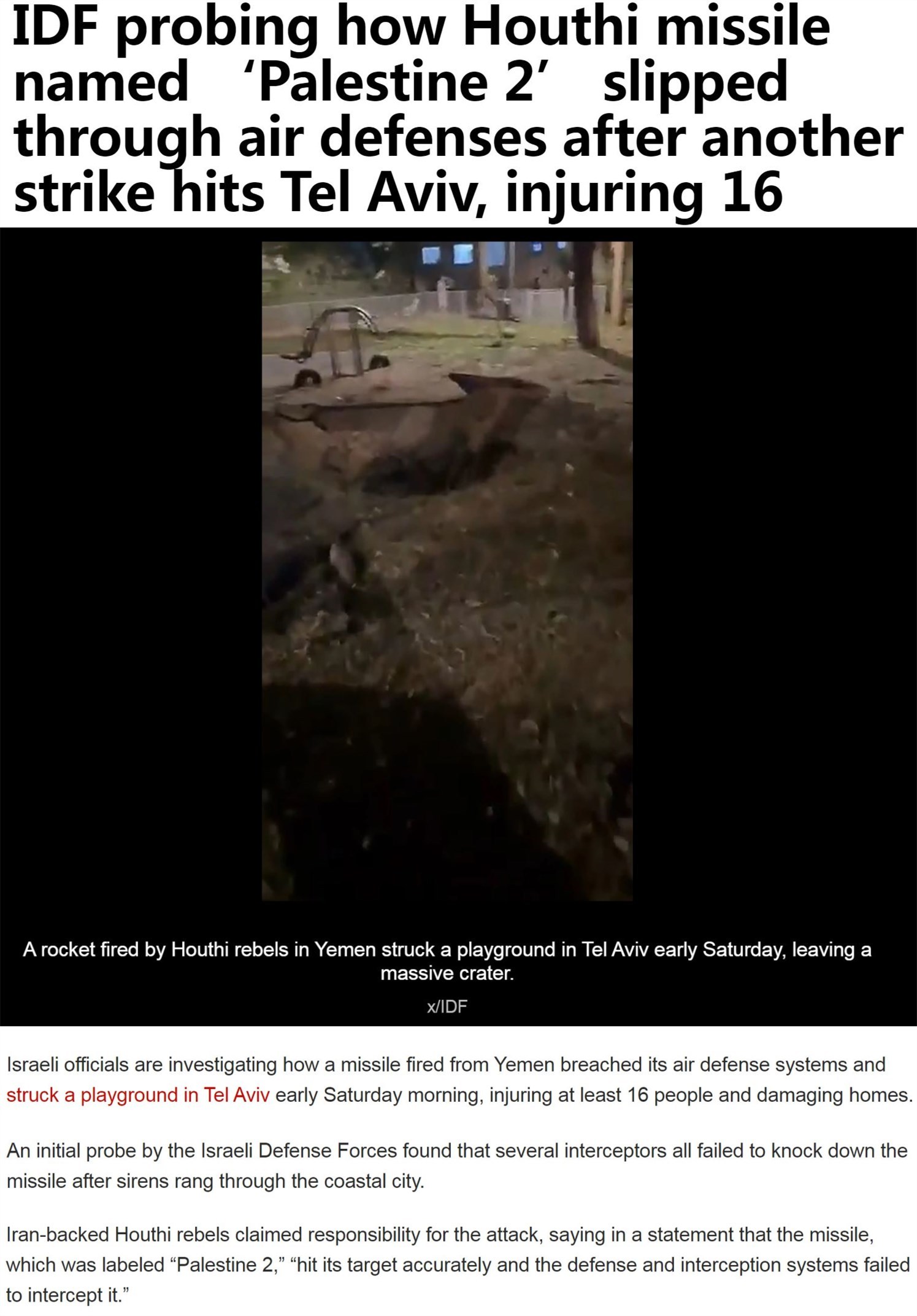 以軍方21日在社交媒體平台上表示,以色列中部當天拉響警報,並發現了一枚從也門發射的導彈,但未能成功進行攔截。以軍正在對“失誤”進行調查。