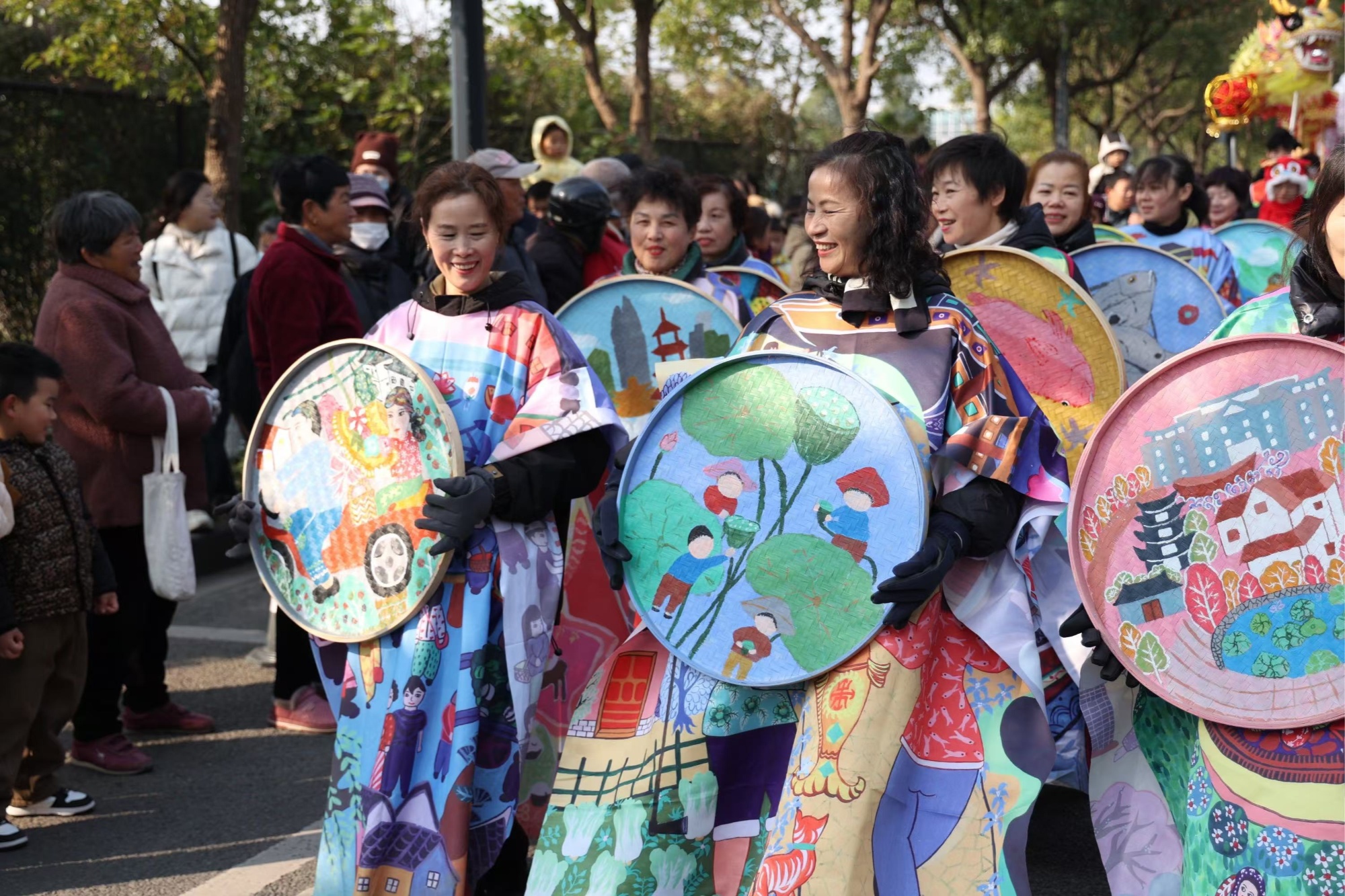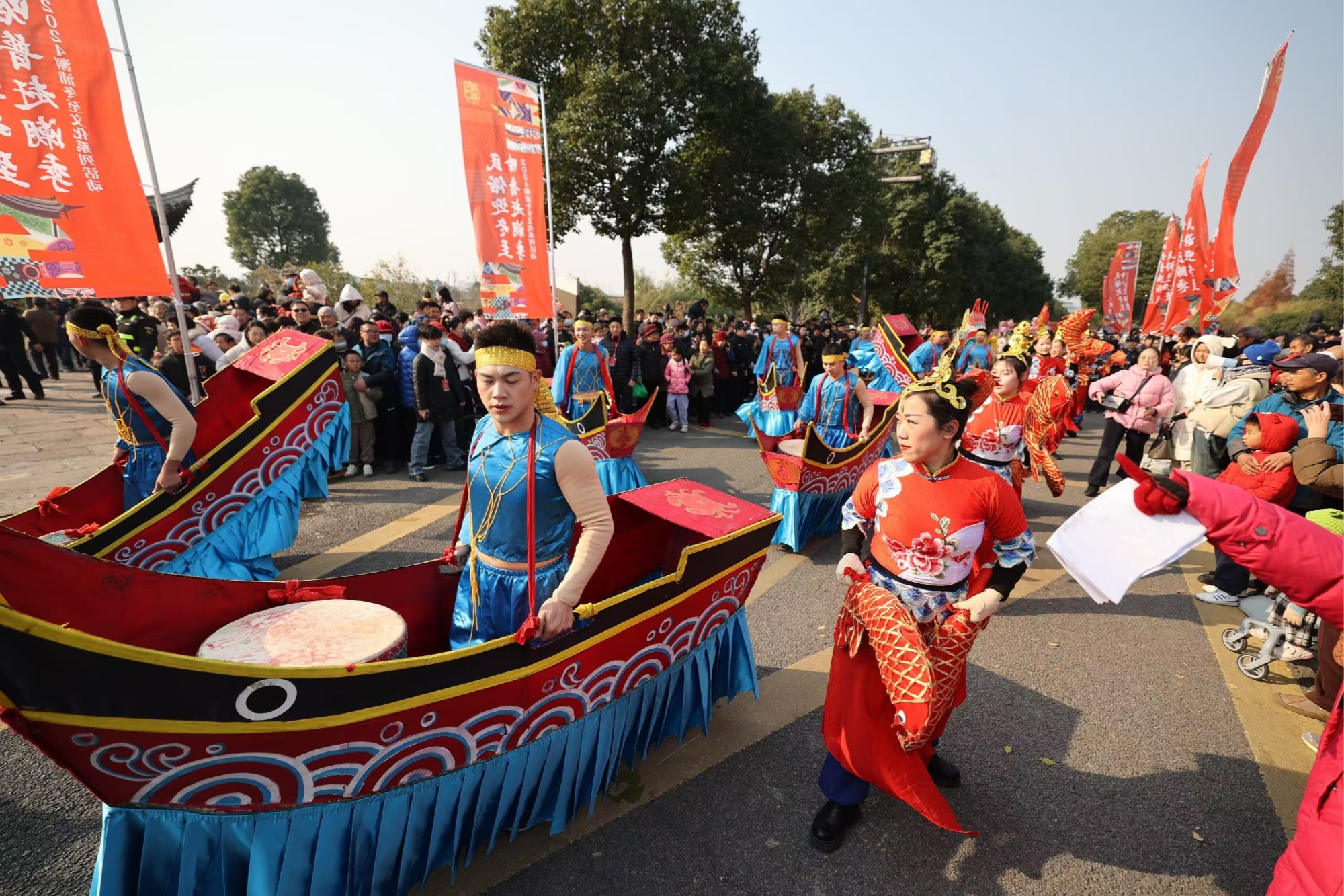 魚燈、船鼓、腰鼓、高蹺、農民畫秀……活動在一場民俗巡遊中拉開了序幕,約500名來自澥浦各村社的民間文藝愛好者組成四個方陣開展巡遊和表演。他們身着傳統服飾,邁着歡騰的步伐,在喧天的鑼鼓聲中全方位展示着澥浦這座千年古鎮的老底子文化。