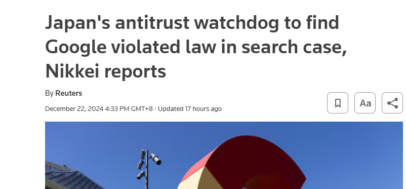 【環球網科技綜合報道】12月23日消息,近日,據路透社援引《日經亞洲》報道,日本公平貿易委員會(JFTC)已裁定,谷歌公司(GOOGL.O)在其網絡搜索服務中違反了該國的反壟斷法。這一決定預計將導致JFTC發佈正式停止命令,要求谷歌立即終止其被認定為壟斷的行為。