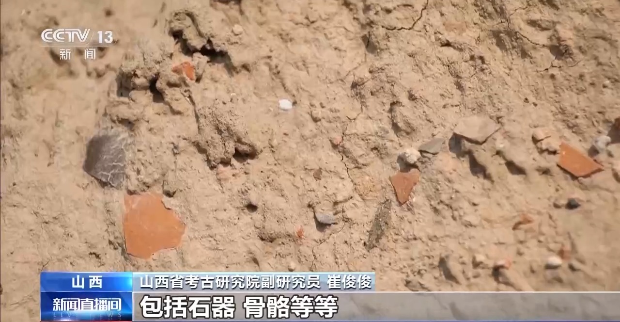 *山西省考古研究院副研究員 崔俊俊:*堆積在灰土裏就是當時先民遺留下來的一些器物,包括石器、骨骼等等。彩色魚紋盆就出土在灰土裏,這個區域是整個遺址的核心區。