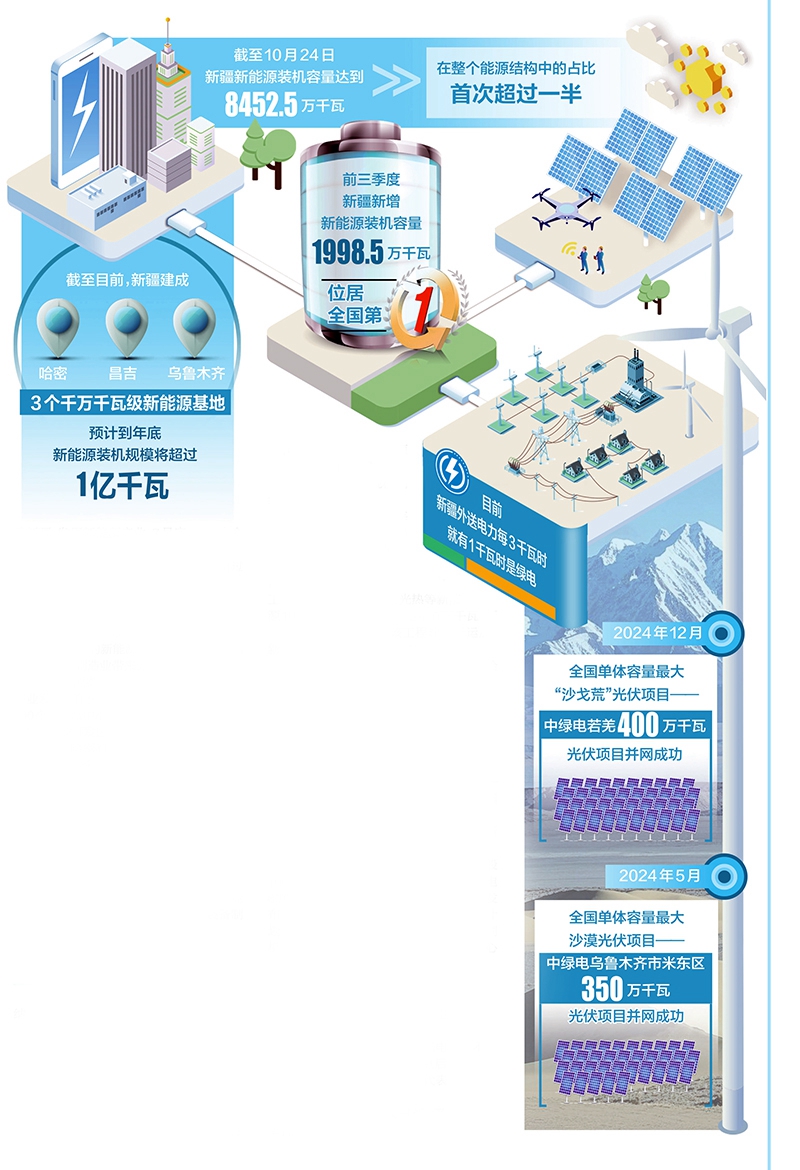 截至10月24日,新疆新能源裝機規模達到8452.5萬千瓦,在整個能源結構中的佔比首次超過一半;前三季度,新疆新增新能源裝機容量1998.5萬千瓦,位居全國第一。