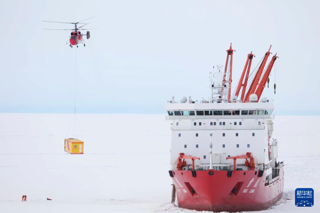 2024年12月7日,直升機將“雪龍”號上的貨物運送至南極中山站。