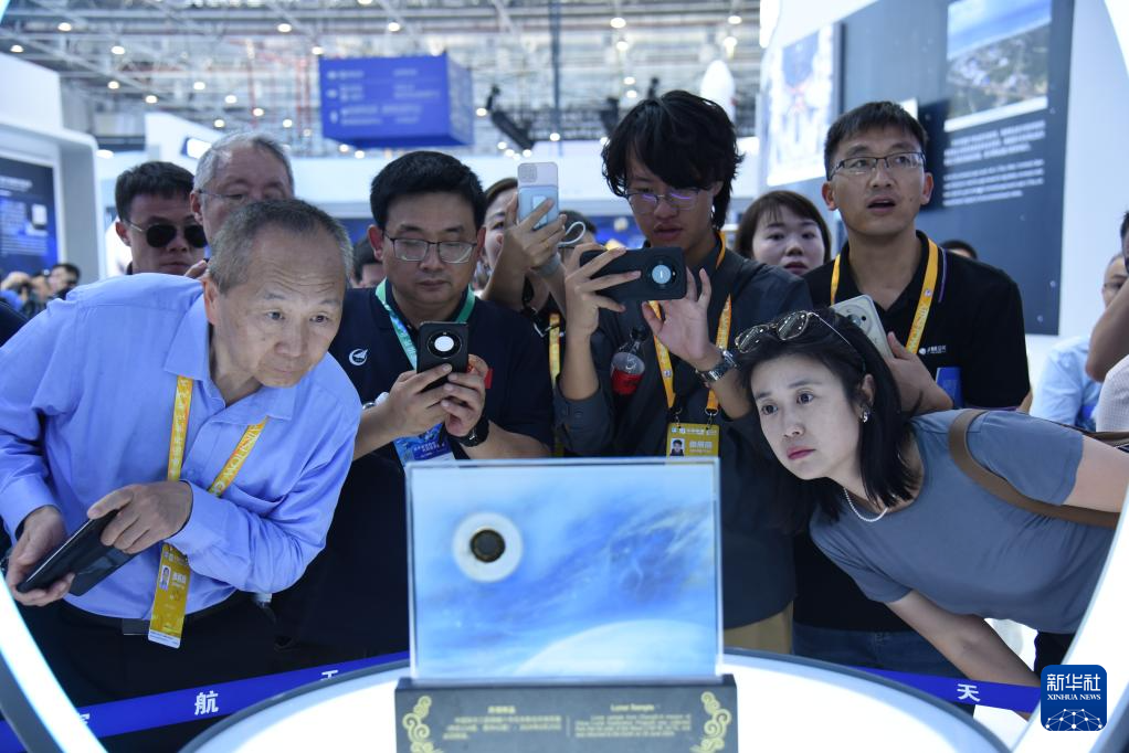 2024年11月12日,在珠海舉行的第十五屆中國國際航空航天博覽會上,觀眾近距離觀察拍攝嫦娥六號取自月球背面的土壤樣品。