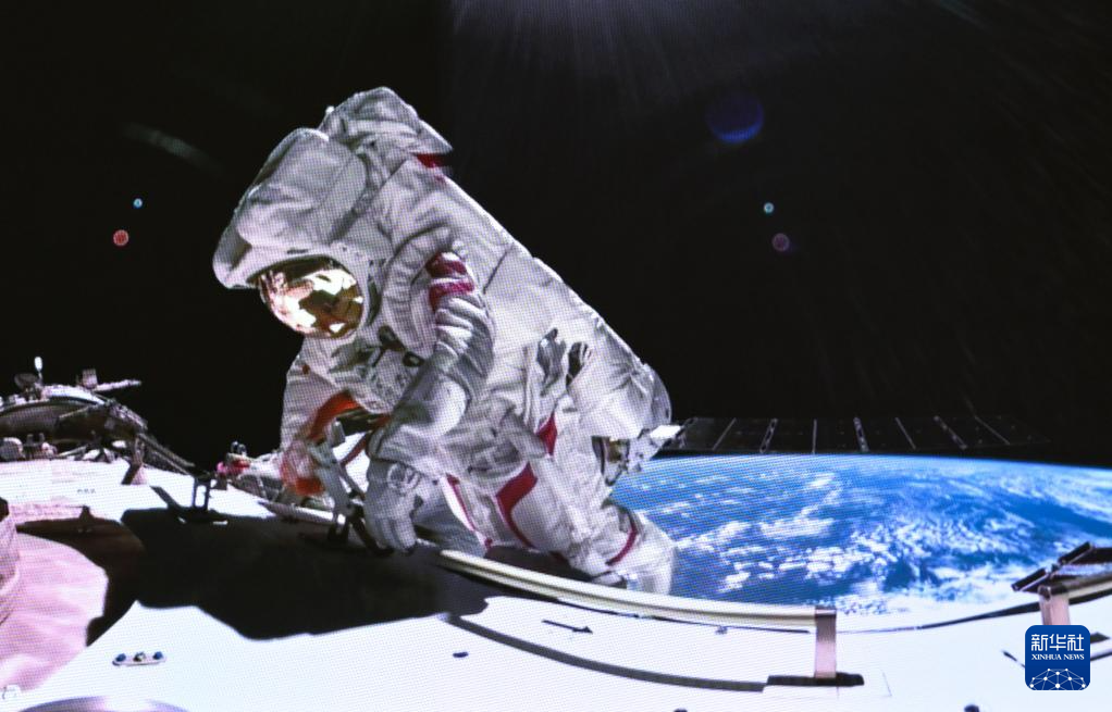 2024年3月2日在北京航天飛行控制中心拍攝的神舟十七號航天員湯洪波在空間站組合體艙外作業畫面。