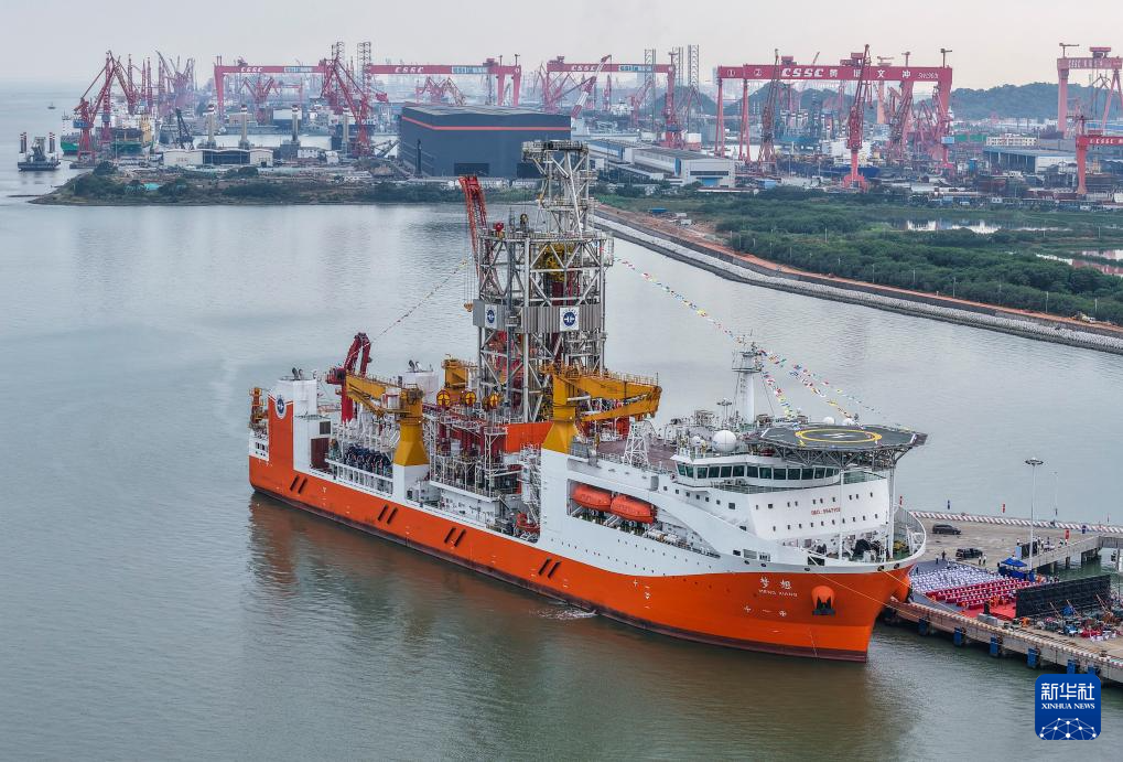 2024年11月17日拍攝的靠泊在廣州海洋地質調查局科考碼頭的大洋鑽探船“夢想”號(無人機照片)。當日,擁有最大11000米的鑽深能力、我國自主設計建造的首艘大洋鑽探船“夢想”號在廣州正式入列,標誌着我國深海探測關鍵技術裝備取得重大突破。