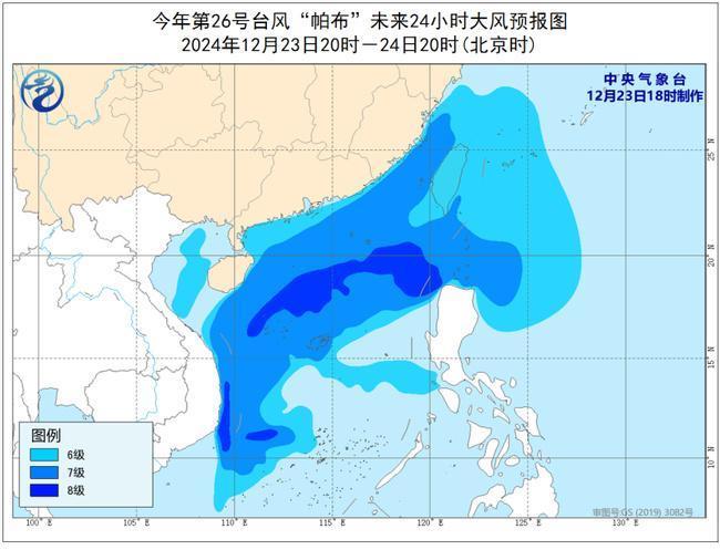 大風預報:23日20時至24日20時,受“帕布”和冷空氣的共同影響,東海南部、台灣以東洋麪、台灣海峽、巴士海峽、北部灣、南海大部以及福建沿海、台灣島沿海、廣東沿海、海南島沿海將有6-7級大風,陣風8-9級,其中南海北部和西部的部分海域以及西沙羣島附近海域風力有8級,陣風9-10級。
