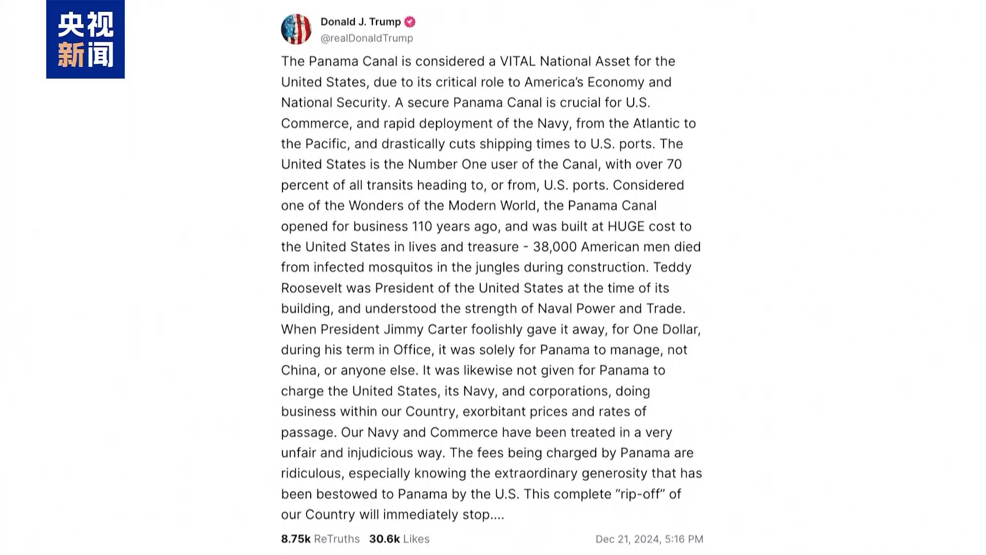 21日,美國當選總統特朗普在社交媒體上發文稱,巴拿馬運河是“美國重要國家資產”,威脅美國將“收回”巴拿馬運河。