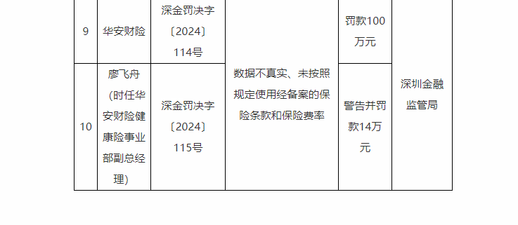 【環球網保險報道 記者 陳超】近日,金融監管總局深圳監管局發佈行政處罰信息,華安財產保險股份有限公司(以下簡稱華安財險)因未按照規定使用經備案的保險條款和保險費率,並且存在數據不真實的行為,被罰款100萬元。同時,時任華安財險健康險事業部副總經理的廖飛舟也被警告並罰款14萬元。