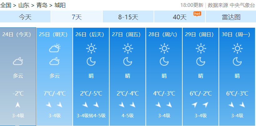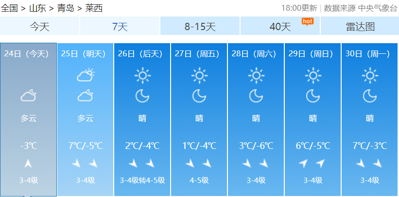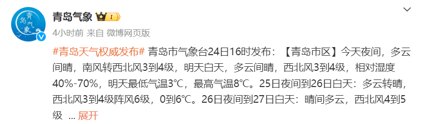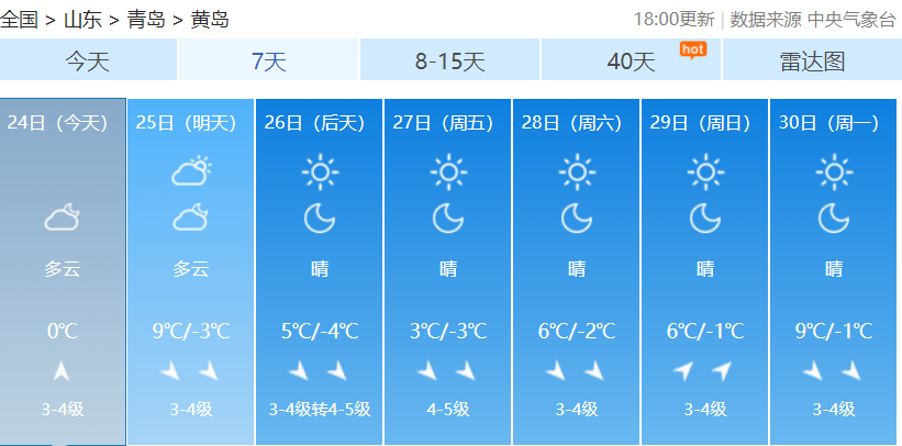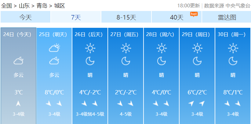 【青島市區】今天白天,多雲間晴,西北風3到4級,相對濕度40%-70%,今天最低氣温3℃,最高氣温8℃。