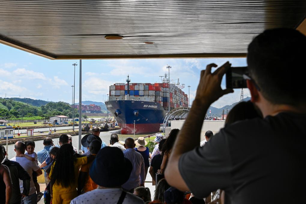 8月28日,在巴拿馬首都巴拿馬城附近,遊客在巴拿馬運河的米拉弗洛雷斯船閘遊客中心觀看貨輪通過船閘駛入太平洋。新華社記者李木子攝