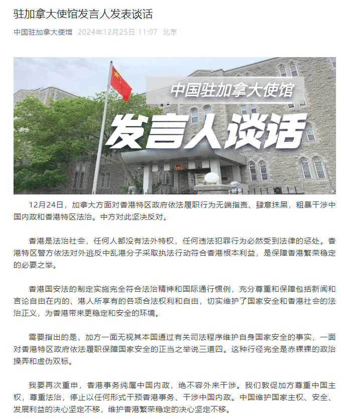 12月24日,加拿大方面對香港特區政府依法履職行為無端指責、肆意抹黑,粗暴干涉中國內政和香港特區法治。中方對此堅決反對。