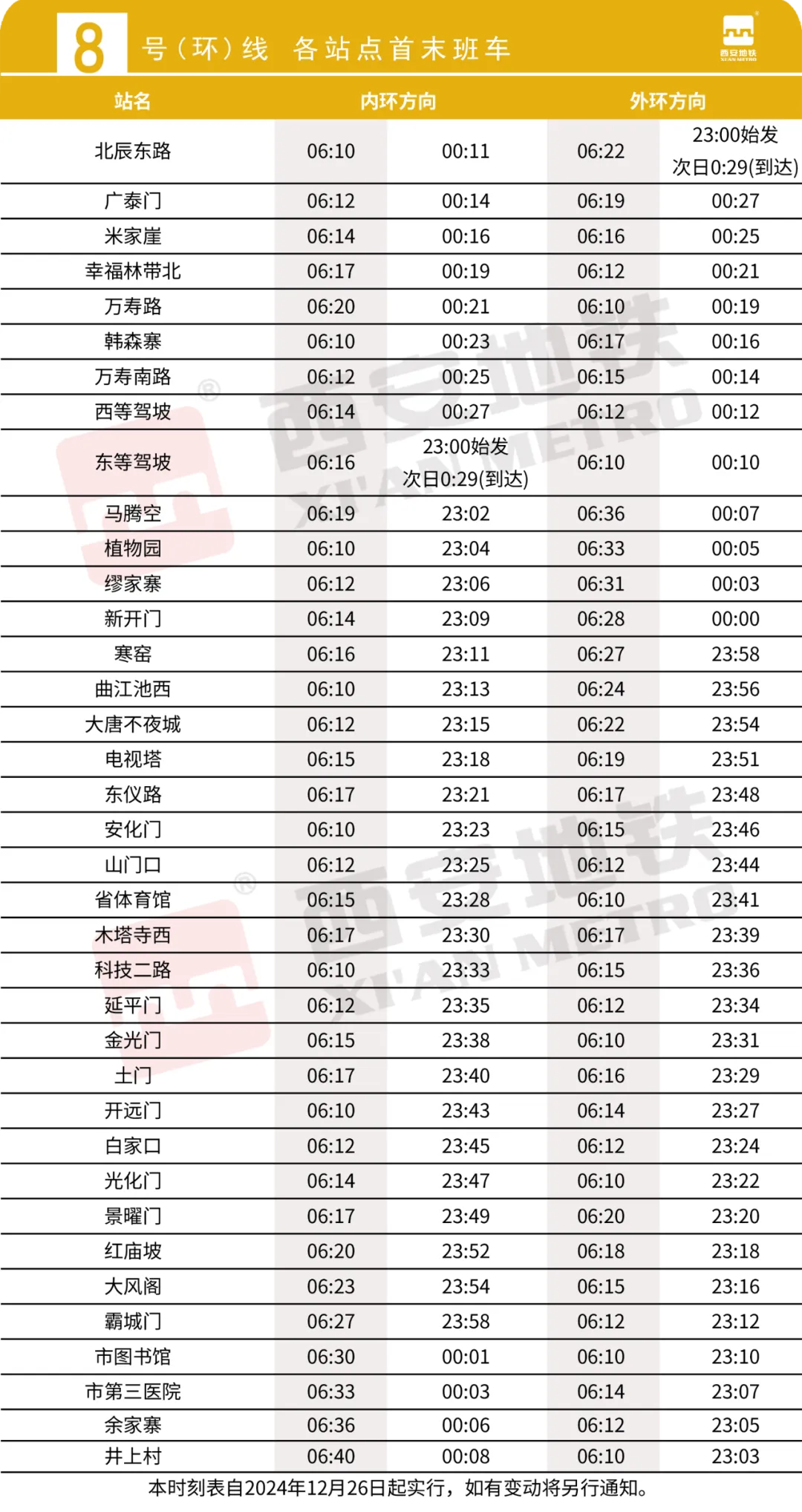 針對環線線路長、車站多等特點,為了方便市民高效出行,地鐵8號(環)線首班車採用多站同時發車的舉措,內環首班車發車車站為北辰東路、韓森寨、植物園、曲江池西、安化門、科技二路、開遠門7座車站;外環首班車發車車站為井上村、市圖書館、光化門、金光門、省體育館、東等駕坡、萬壽路7座車站,上述各車站均於每日6點10分同時發車投入運營。