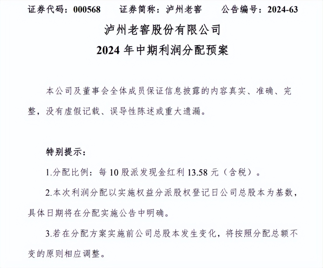 在眾多披露分紅方案的公司中,瀘州老窖和山西汾酒於24日晚間發佈的現金分紅計劃受到市場關注。瀘州老窖擬向全體股東每10股派發現金紅利13.58元(含税),總計約20億元(含税)。而山西汾酒則計劃每股派發現金紅利2.46元(含税),總計約30.01億元(含税)。此前,五糧液和貴州茅台也已發佈或實施了中期現金分紅方案,其中五糧液擬每10股派發現金紅利25.76元(含税),總計100億元(含税),而貴州茅台的分紅方案更為慷慨,每股派發現金紅利高達23.882元(含税),總計約300億元(含税)。