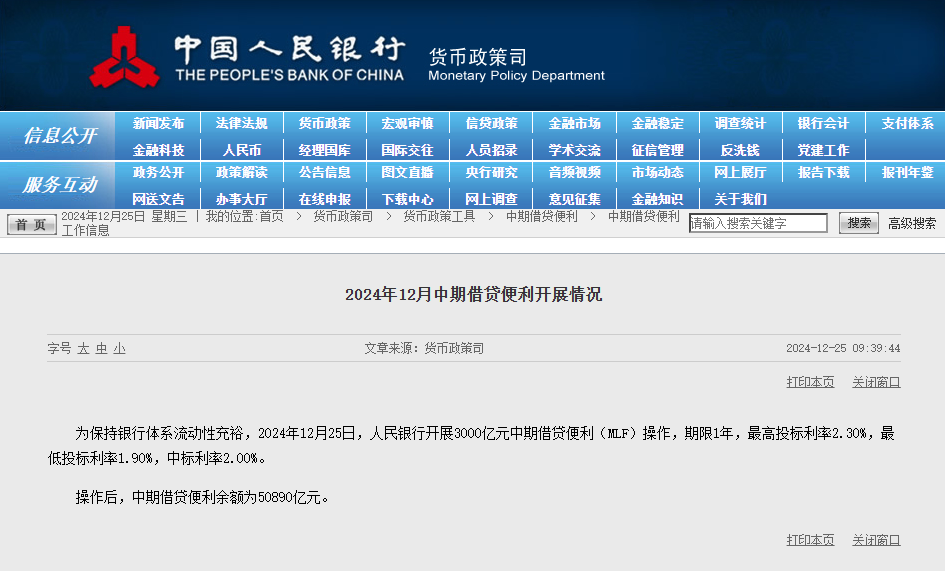 *央視財經(記者 吳哲鈺)*12月25日,中國人民銀行發佈公告開展1年期中期借貸便利(MLF)操作3000億元,當月16日MLF到期1.45萬億元。與此同時,臨近年末資金面維持寬鬆,貨幣市場利率圍繞政策利率平穩運行。