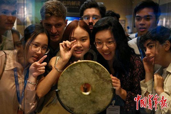 8月14日,浙江杭州,良渚博物院,來自各國的青年代表圍在刻鳥立高台符玉璧前仔細觀摩。該展品在一定的光線下可以看到雕刻在玉璧上方的“鳥立高台符”,體現了5000多年前良渚文化極高的雕刻工藝。亞歐青年領導人交流營活動在浙江杭州舉行,來自47個國家的50餘名青年代表走進良渚博物院,感受中華文明五千年的魅力。中青報·中青網見習記者 田嘉碩/攝