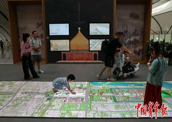 8月10日,北京大興國際機場航站樓北京中軸線主題展覽展區,一位小旅客趴在地上“觸摸”中軸線相關區域的地圖投影。7月27日,在印度新德里舉行的聯合國教科文組織第46屆世界遺產大會上,“北京中軸線——中國理想都城秩序的傑作”被列入《世界遺產名錄》。北京大興國際機場位於北京中軸線南延長線最南端,被譽為“新國門”,是首都北京迎接廣大國內外旅客的重要空中門户,投運以來已經運送旅客超過1.2億人次。中青報·中青網記者 陳劍/攝