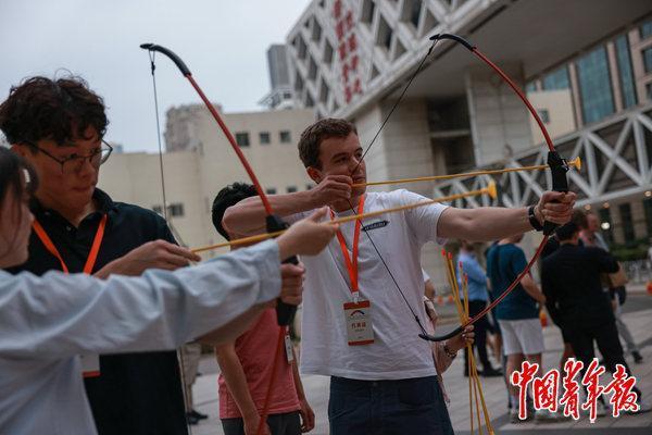 6月12日,北京世紀劇院,《Bridge》中美青年友好會見主題音樂會開始前,美國青年體驗中國傳統民俗“射五毒”。本場音樂會是“未來之橋”中美青年交流計劃的首場在京集中活動,中美青年共同回顧兩國友好交往歷史,分享合作故事,現場表演了精彩紛呈的文藝節目,共同體驗中國非遺文化,在熱情友好的氣氛中深化友誼與共識。中青報·中青網記者 曲俊燕/攝