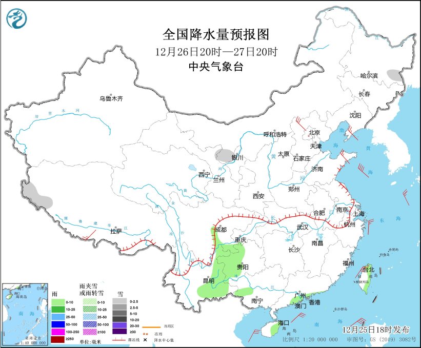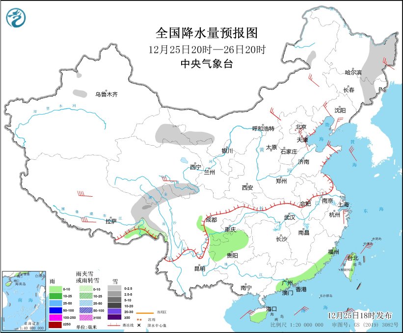 圖2 全國降水量預報圖(12月25日20時-26日20時)