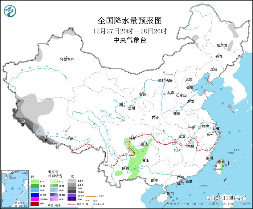 25日夜間至27日,受冷空氣影響,中東部大部自北向南先後有2~4℃降温,西北地區東部、東北地區、華北西部、江漢、江南東部等地部分地區有4~6℃降温,其中,甘肅東部、東北地區東部等地局地降温8℃以上。預計,12月25日20時至26日20時,西藏北部、青海南部和東北部、川西高原、內蒙古中東部、河北北部、北京、天津、遼寧西部和南部、山東半島等地部分地區有5~6級風、陣風7~8級;渤海、渤海海峽、黃海北部和中部海域、東海南部海域、台灣海峽、台灣以東洋麪、巴士海峽、南海北部和西南部海域將有7~8級、陣風9~10級的大風(見圖1)。中央氣象台12月25日18時發佈大風藍色預警。